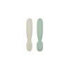 The textured tips (wavy and nubbed) are specially designed to optimize food grasping, while the flat tips prevent overloading the spoon, allowing use on both sides without needing to rotate the wrist. The flexible tips are specifically designed to adapt to the child’s needs (the wavy spoon is less flexible than the nubbed version).