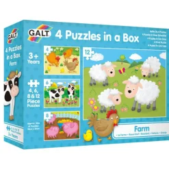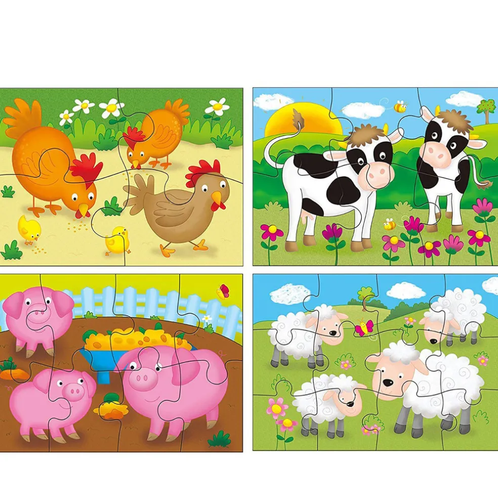 Five fun sets of 4 first puzzles with a different number of pieces to encourage the development of matching and sorting skills. Vehicles and Farm puzzles have 4, 6, 8 and 12 pieces. Dinosaurs, Fairies and Jungle puzzles for 2019 have 12, 16, 20 and 24 pieces. The new Animals and Woodland puzzles for 2020 have 2, 3, 4, and 5 pieces.