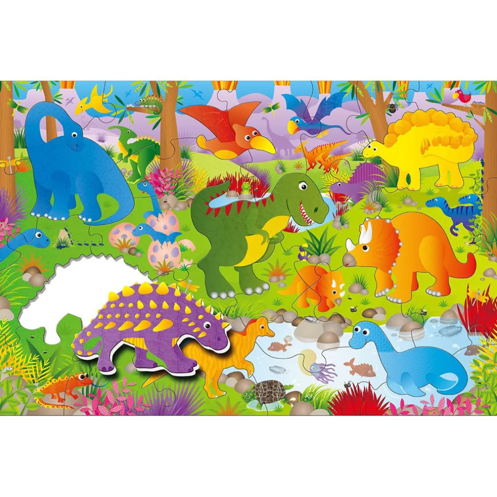 6 extra large floor puzzles with colourful illustrations featuring fun Farm, Jungle, Town, Theme Park, Construction and Dinosaur scenes. Each puzzle has 30 pieces including 8 templates in the shape of animals, vehicles, rides and buildings. New for 2019 is Giant Floor Puzzle,Theme Park, with template pieces in the shape of rides and attractions. There are so many interesting things to find in these puzzles that children will return to them time and time again. The large, easy to handle pieces are made in thick board with a wipe-clean surface.