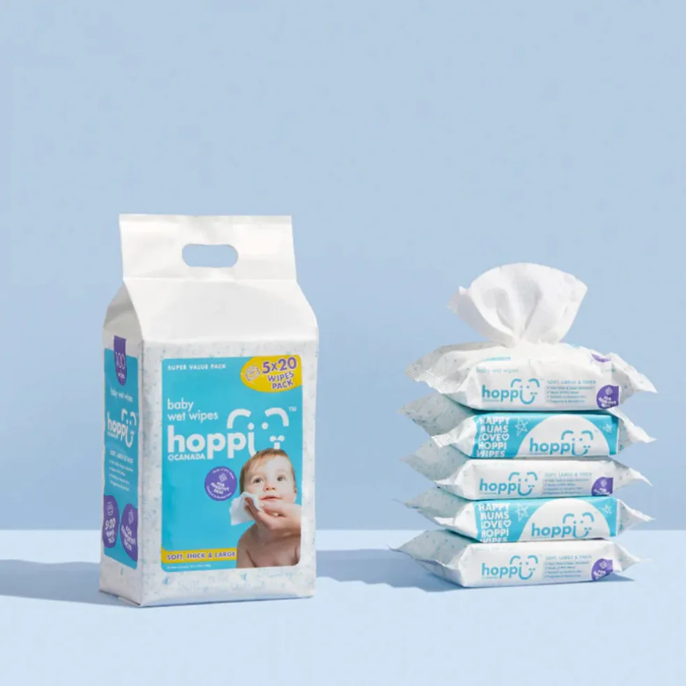 Hoppi⢠Baby Wet Wipes is a 99% water wet wipes specially designed for the newborn & sensitive skin babies. It is softer, thicker, larger, and more durable than the average baby wet wipes in the market, while adhering to the highest international standards.