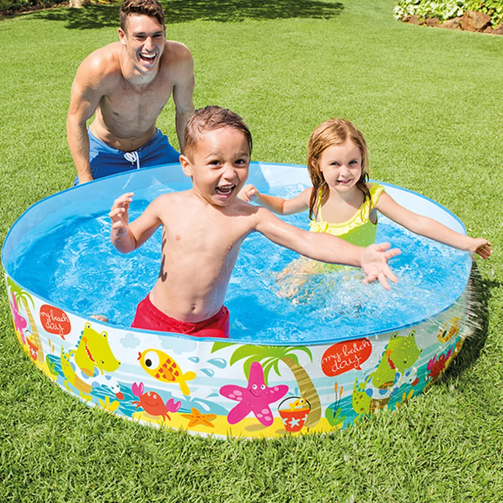 The Intex Under the Palm Trees Snapset Pool is remarkably easy to setup. Simply fill with water to hold the sides up and your little ones will be cooling off from the summer heat in minutes in the backyard. Kids can splash and have fun all day in this pool.
