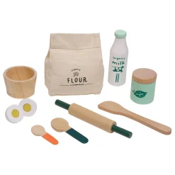 Mix-up toddler play time with the Bunny Hop Mixer! The ten-piece wood set includes one bunny-themed mixer, one mixing bowl, one small spoon, one large spoon, one rolling pin, one spatula, one sugar jar with removable lid, one milk bottle with removable cap, one egg – two halves that attach to one another and one fabric flower bag. Pull back on the handle between the bunny ears to lift the wooden mixer blades and turn the mushroom to make them spin. Encourages imaginative role-play, cause and effect learning and motor skill development.