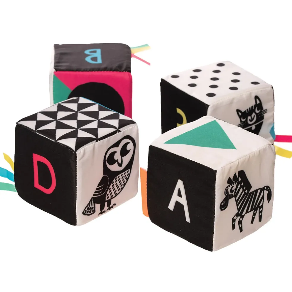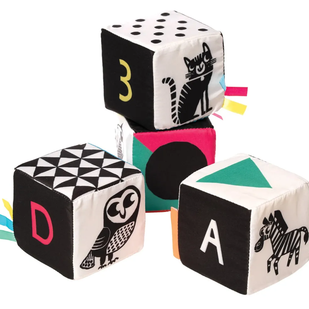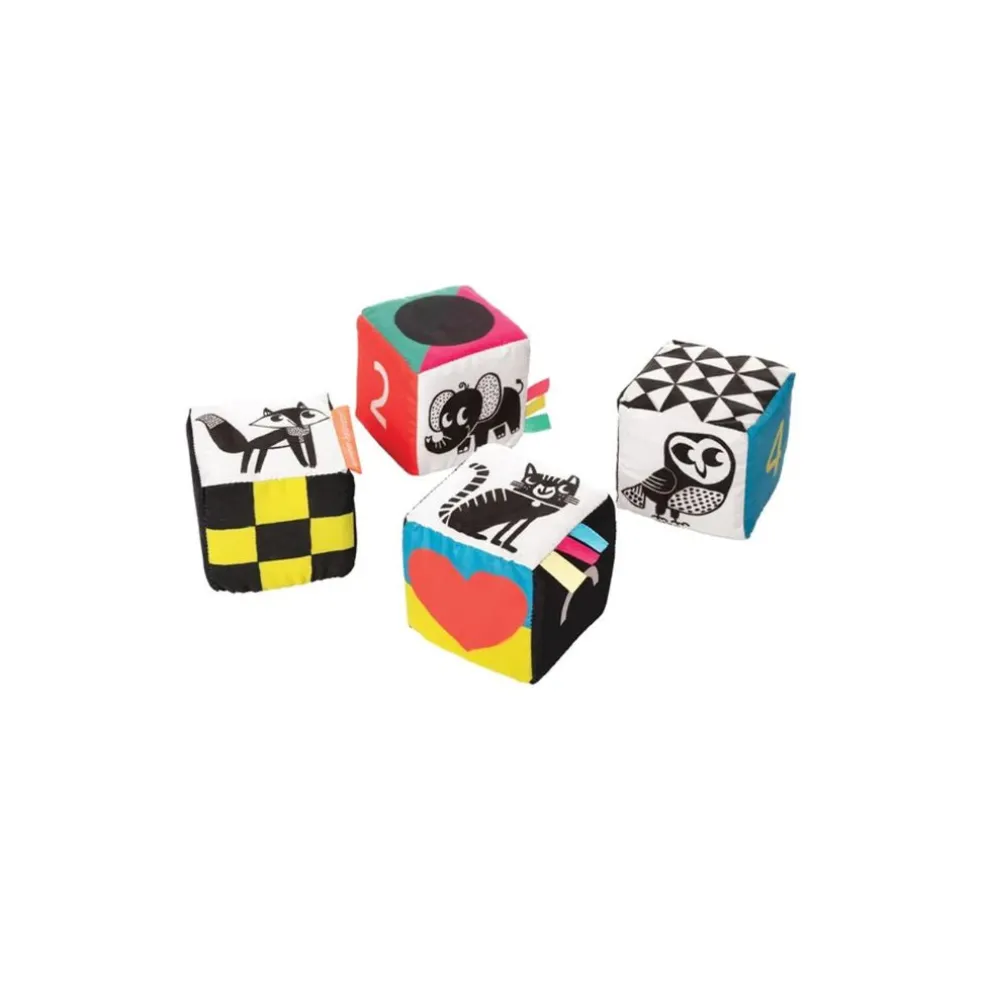 This set of 4 soft cubes feature ribbons, numbers, letters, shapes and patterns in research proven high-contrast graphics. Stilumate baby’s visual development with the Wimmer-Ferguson Mind Cubes.