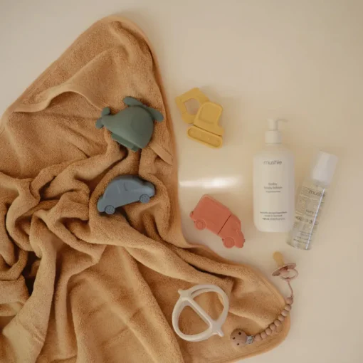 Let your child’s imagination travel far and wide with the vehicles bath play set that includes a helicopter, car, truck and excavator. Made from 100% food grade silicone, the soft material is easy for little hands to hold while wet or dry. Its inventive design allows each toy to open into two separate pieces for thorough cleaning and fast drying. This feature allows the toys to remain mold-free with its easy-to-clean pieces that are dishwasher safe. After each use, we recommend opening the pieces to rinse out and air dry before storing.