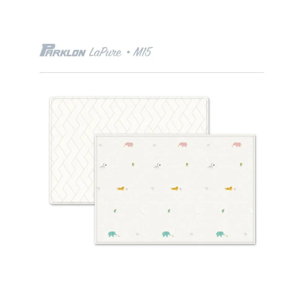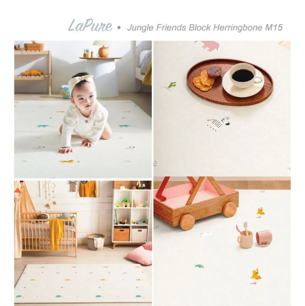 Parklon latest design for the LaPure range soft play mat. This design combination and 15mm thickness for size M is customised uniquely for Singapore market only (not available in other countries). This play mat has cute animals motif with soft colours on one side and a simple modern herringbone pattern with light colour on the other side – it is very versatile and easy to match with any living spaces.