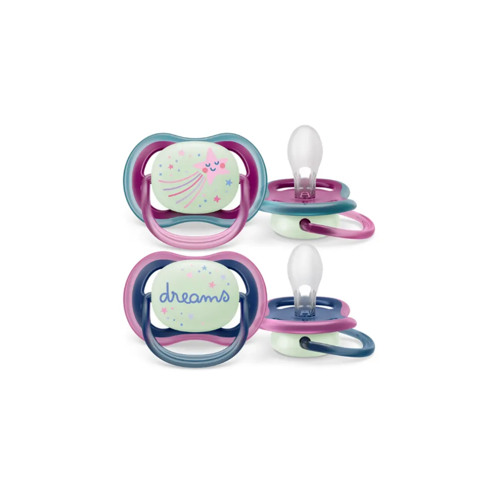 Soothe with the comfort of air. The Philips Avent ultra air has extra-large holes to keep skin dry. It has a glow-in-the-dark button so you can see it when the lights are out. Available in various colors and designs.