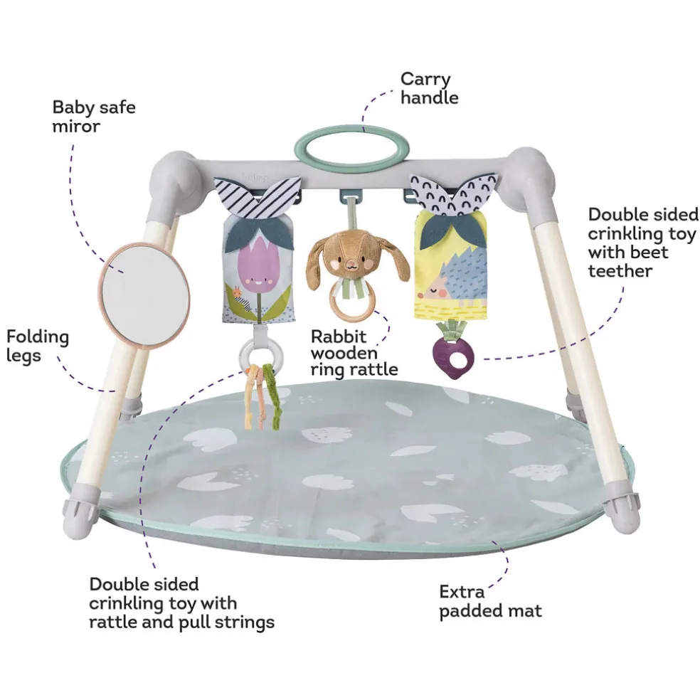 - Stylish sturdy take along baby gym with foldable legs and a padded playmat, easy to fold and carry when out and about.