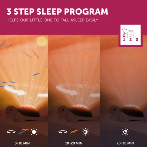 - 3 Step sleep programHelps your little one to fall asleep. In 2 steps the animation gets more quiet and soft. The projector will automatically shut off after 30 minutes.