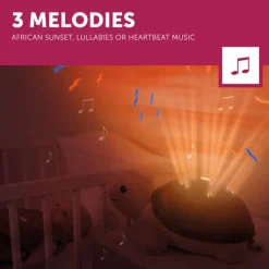 - 3 Soothing melodiesYou have choice of 3 melodies: African sunset music, lullabies or heartbeat sound.