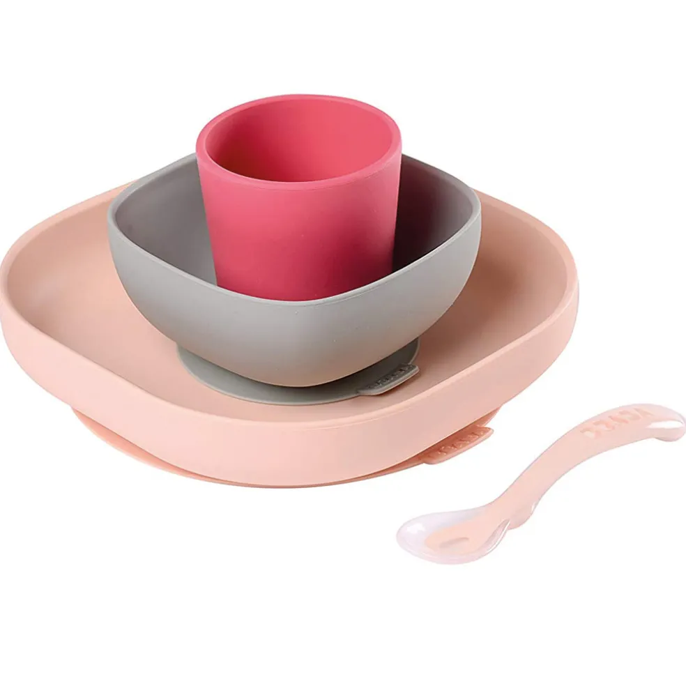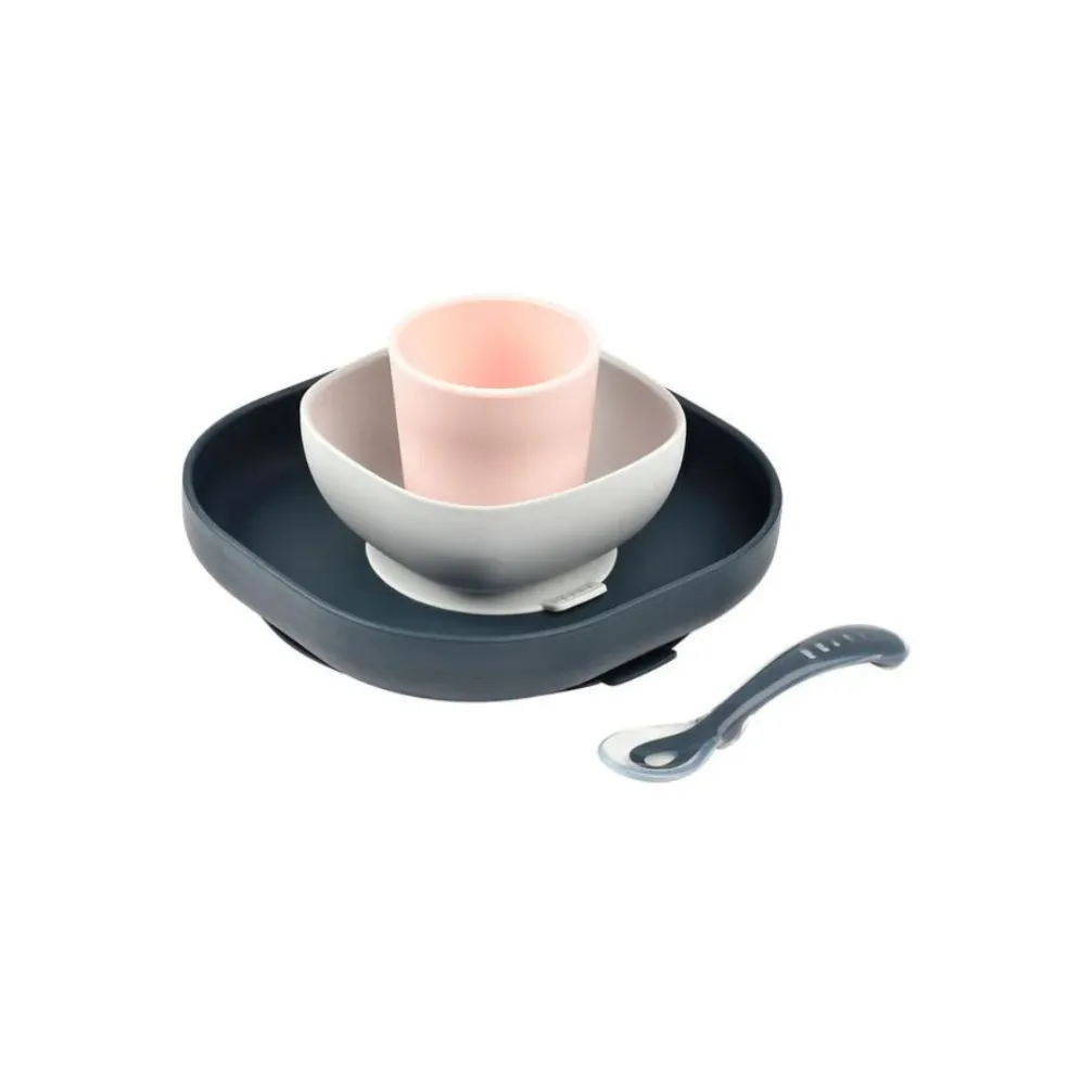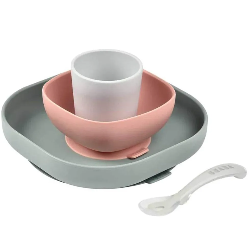 - 4-piece meal set includes: non-slip suction bottom plate, non-slip suction bottom bowl, non-slip cup, 2nd Stage Silicone Spoon