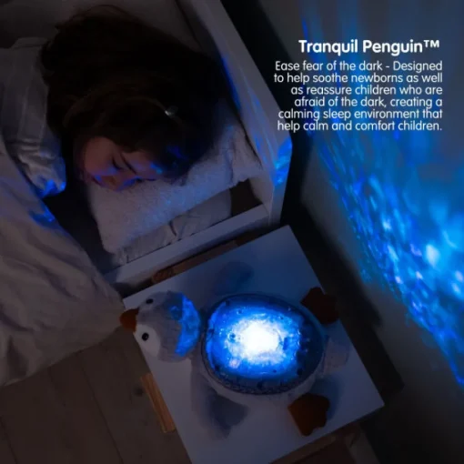 Tranquil Penguin projector nightlight features 4 soothings sounds, comes with an intelligent cry sensor to better soothe little ones to sleep and transform children’s room into a peaceful oasis.