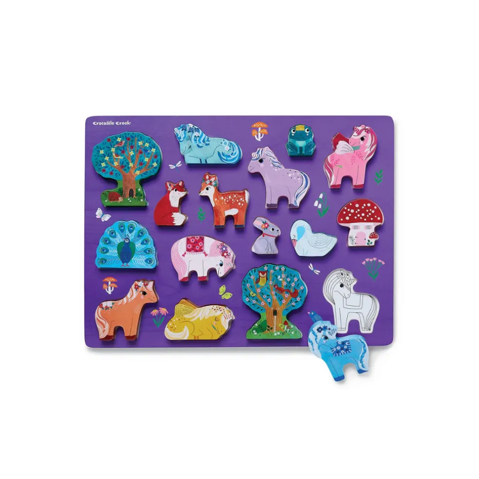 It’s a puzzle! It’s a playset! The Unicorn Garden puzzle is a wonderful early learning puzzle with 16 different chunky wood pieces that match an underlying image! With stand-up chunky pieces and a beautifully illustrated play scene on the reverse side, it can also be a playset that is perfect for interactive and imaginative play. For kids ages 2 Years and up.