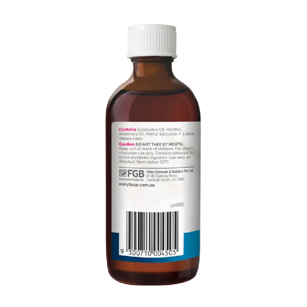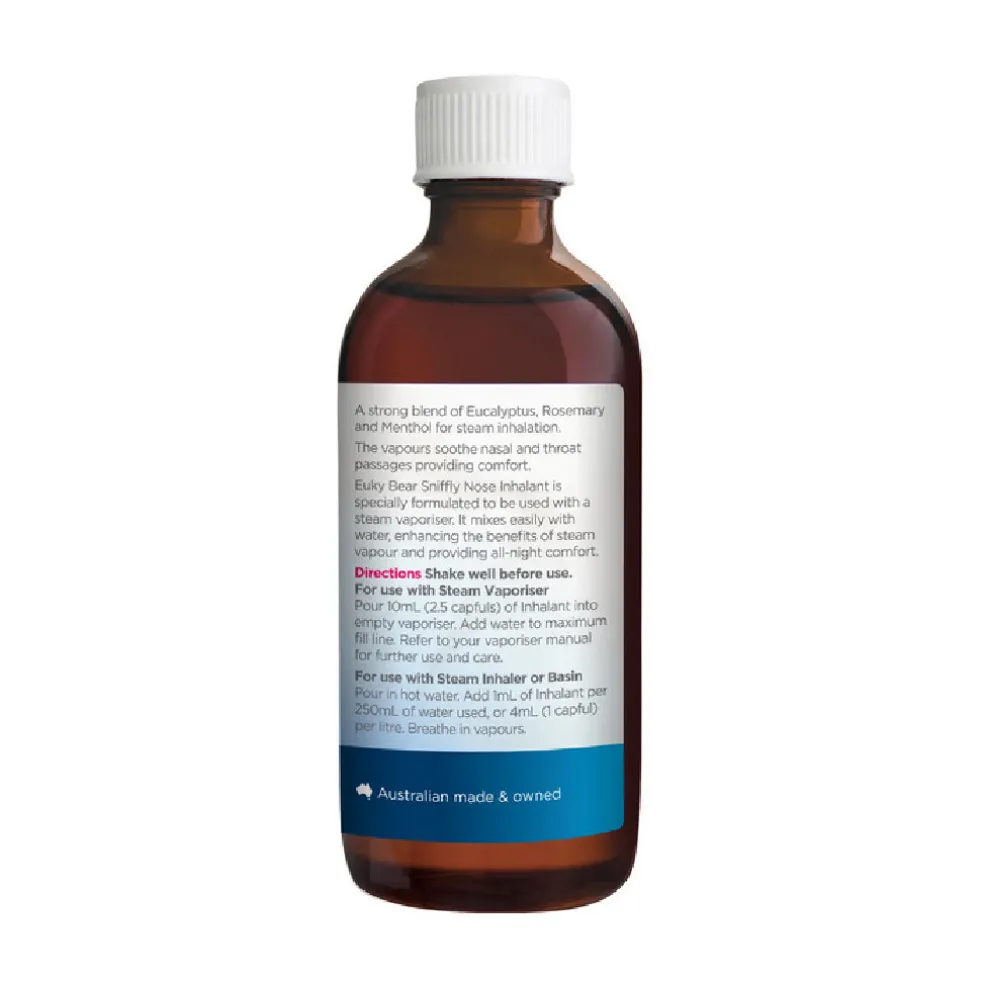 A strong blend of eucalyptus, rosemary and menthol for steam inhalation. The vapours soothe nasal and throat passages providing comfort to children of all ages. Euky Bear Sniffly Nose Inhalant is specially formulated to be used with a steam vaporiser. It mixes easily with water, enhancing the benefits of steam vapour and providing all-night comfort.