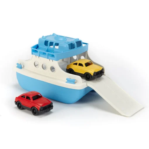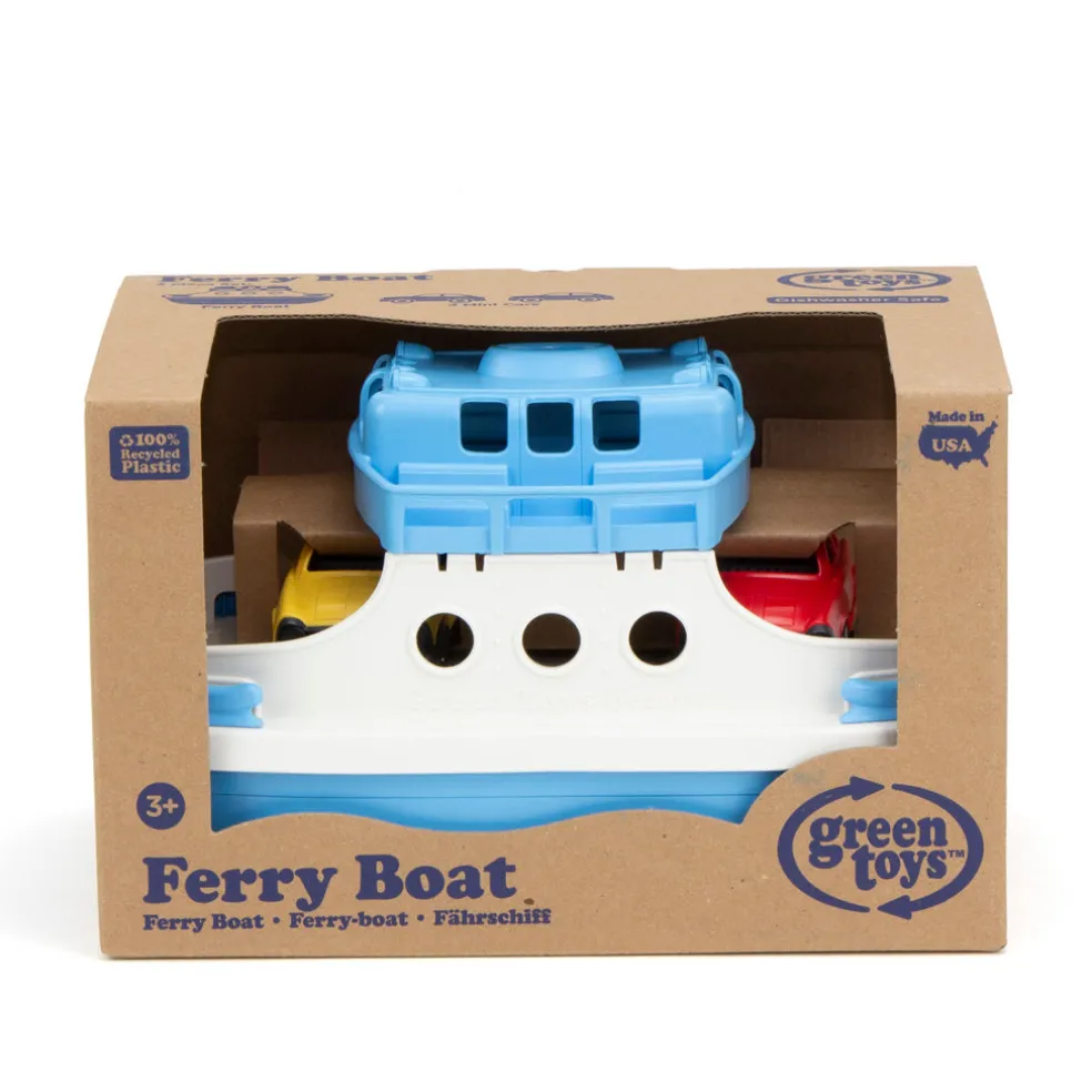 Set sail with the Green Toys Ferry Boat for a quick bathtub excursion or an extended trans-pool voyage. Whatever the adventure, this two-story vessel is ready to hit the open water with room for eco-friendly cargo galore, and even comes with two Green Toys Mini Fastbacks. Use the slide-out ramp to load up the spacious bottom level that accommodates up to four Green Toys cars. The open top deck features two small benches on each side, as well as eleven windows looking down into the main level. Made in the USA from 100% recycled plastic milk jugs that save energy and reduce greenhouse gas emissions, this craft is ideal for any body of water – durable, buoyant, and dishwasher safe. The hull also detaches for easy cleaning.