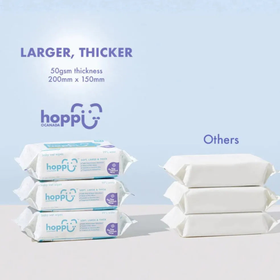 Hoppi⢠Baby Wet Wipes is a 99% water wet wipes specially designed for the newborn & sensitive skin babies. It is softer, thicker, larger, and more durable than the average baby wet wipes in the market, while adhering to the highest international standards.
