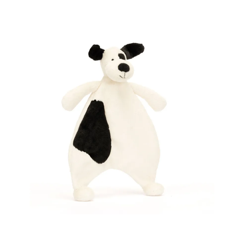 The Bashful Black & Cream Puppy Comforter is a portable patch of softness. This characterful puppy has been designed to comfort with squashy paws to hold onto and an un-stuffed tummy to hug. Made with soft cream fur of recycled fibres with adorable perky black ears, embroidered eyes and an oval squishy nose, Bashful Puppy will be a faithful friend for any newborn.