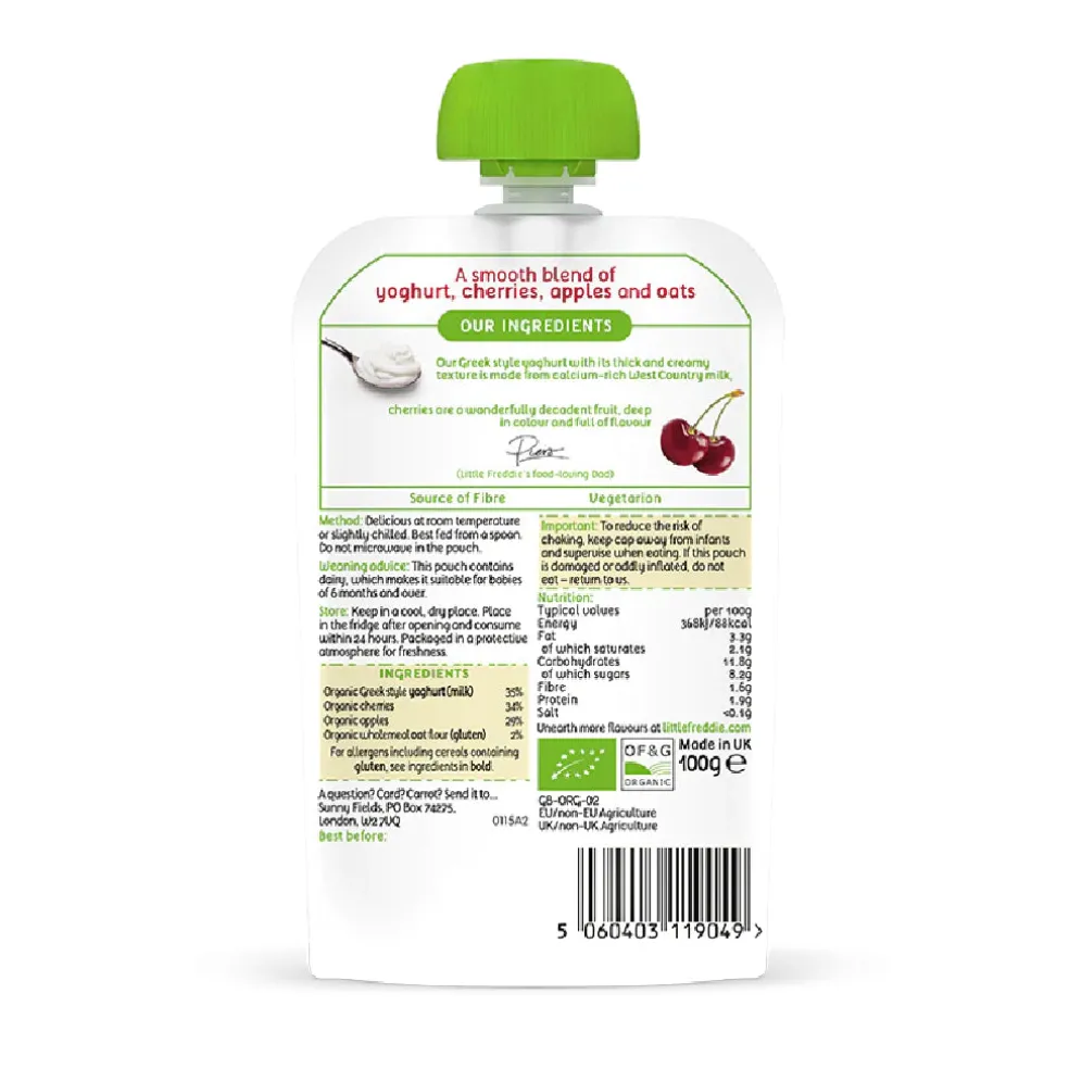 35% Organic Greek style yoghurt (milk), 34% Organic cherries, 29% Organic apples, 2% Organic wholemeal oat flour
