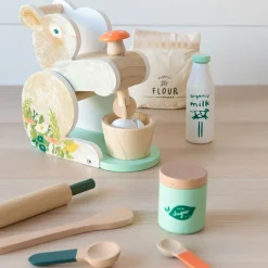 Mix-up toddler play time with the Bunny Hop Mixer! The ten-piece wood set includes one bunny-themed mixer, one mixing bowl, one small spoon, one large spoon, one rolling pin, one spatula, one sugar jar with removable lid, one milk bottle with removable cap, one egg – two halves that attach to one another and one fabric flower bag. Pull back on the handle between the bunny ears to lift the wooden mixer blades and turn the mushroom to make them spin. Encourages imaginative role-play, cause and effect learning and motor skill development.