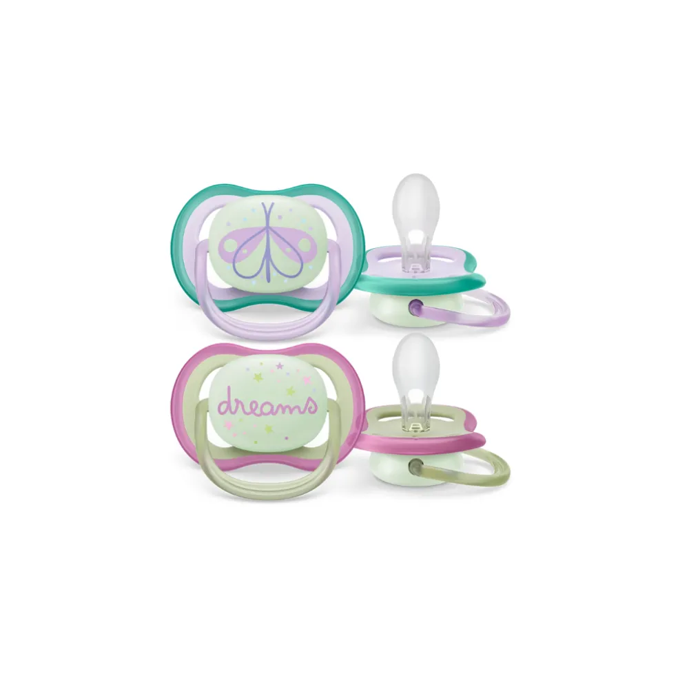 Soothe with the comfort of air. The Philips Avent ultra air has extra-large holes to keep skin dry. It has a glow-in-the-dark button so you can see it when the lights are out. Available in various colors and designs.