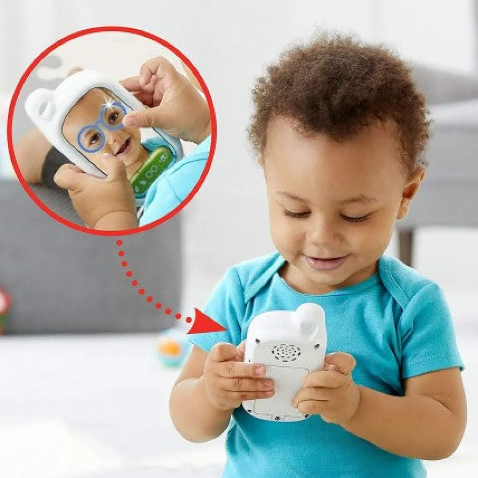 Baby’s first selfie! Thanks to its mirrored surface, this adorable toy phone encourages self-recognition at playtime. Three light-up face filters are fun for little ones to explore—from goofy glasses to cute dog ears and more. Awesome sound effects, including barks and meows plus cheerful tunes add to the fun!